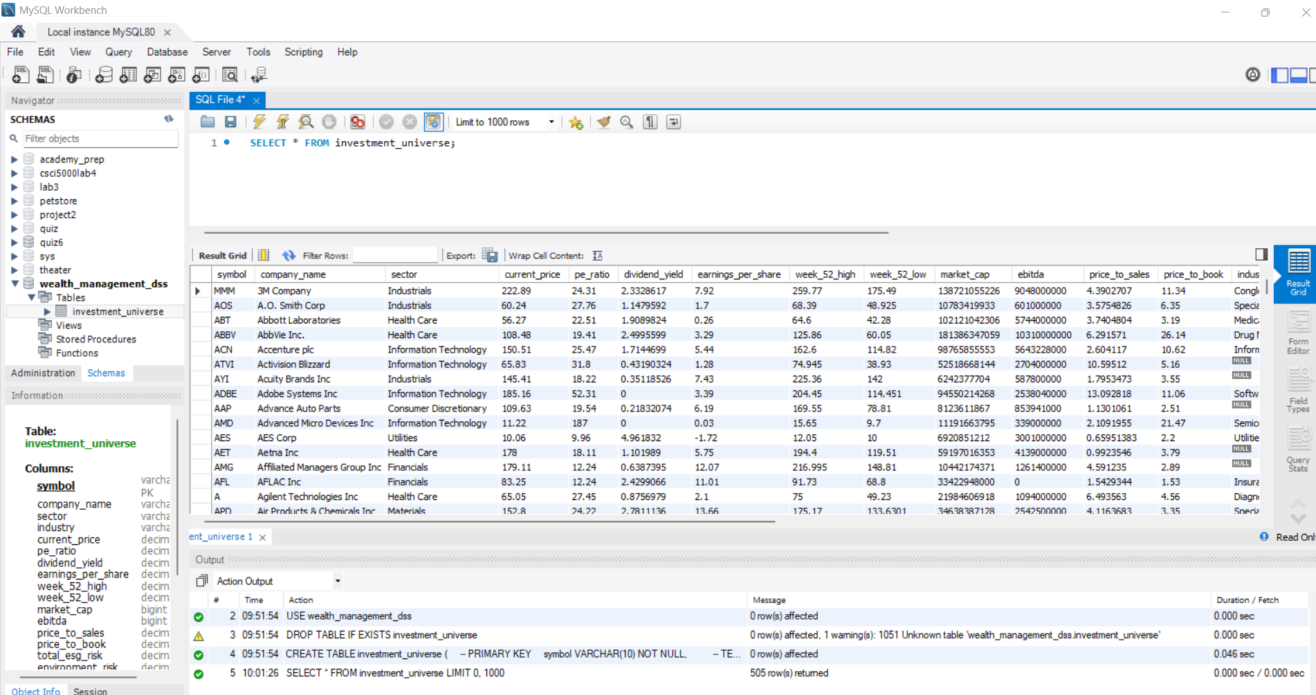 - Implemented an ETL workflow with data quality discovery (e.g., mismatched tickers, missing ESG coverage) and schema-enforced loading into MySQL.